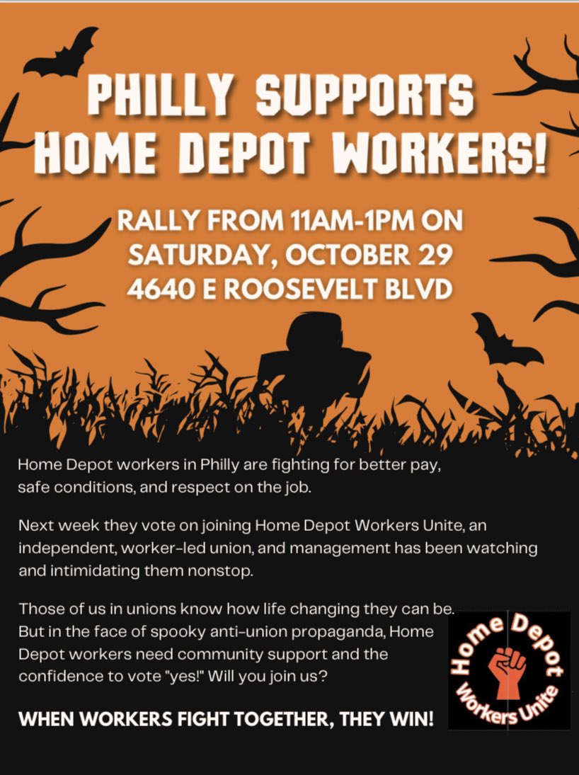 TODAY: Join Philly Home Depot workers to rally ahead of their union vote next week! Management is working overtime with anti-union tactics, including monitoring worker conversations, to discourage them from unionizing. Workers need our support! 11am-1pm 4640 Roosevelt Blvd https://t.co/GVAfaA2428 |