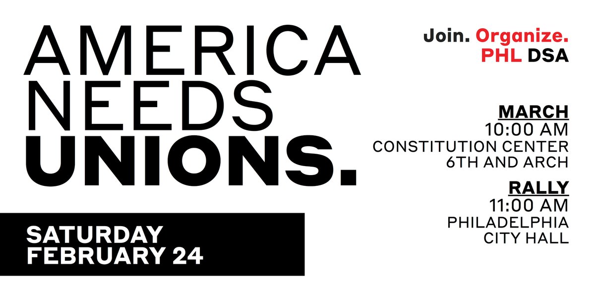 TOMORROW! Join Philly DSA as we fight to protect our unions! DSA contingent will be meeting up on the SW corner of 5th and Arch at 9:45 and then head over to join the march. See you all there! https://t.co/LqOo1b948f |