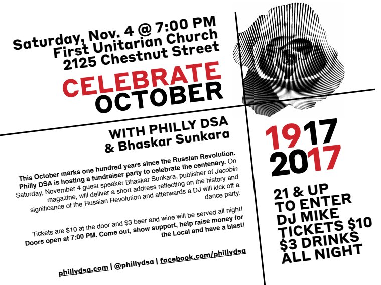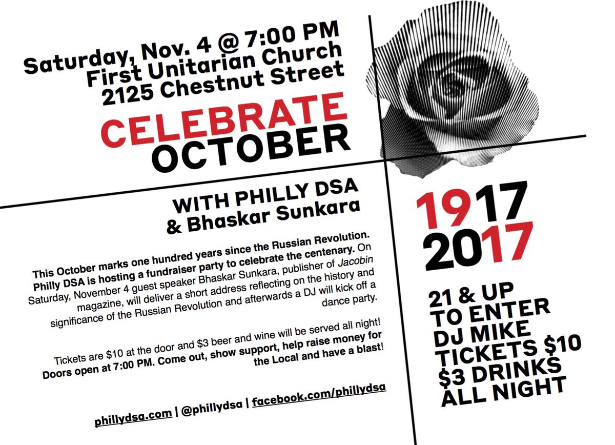Come hang out with us! This Saturday @ First Unitarian, we're going to discuss the 1917 revolution, then party! https://t.co/s7dCMPNmeA https://t.co/3yjdLJjb6J |