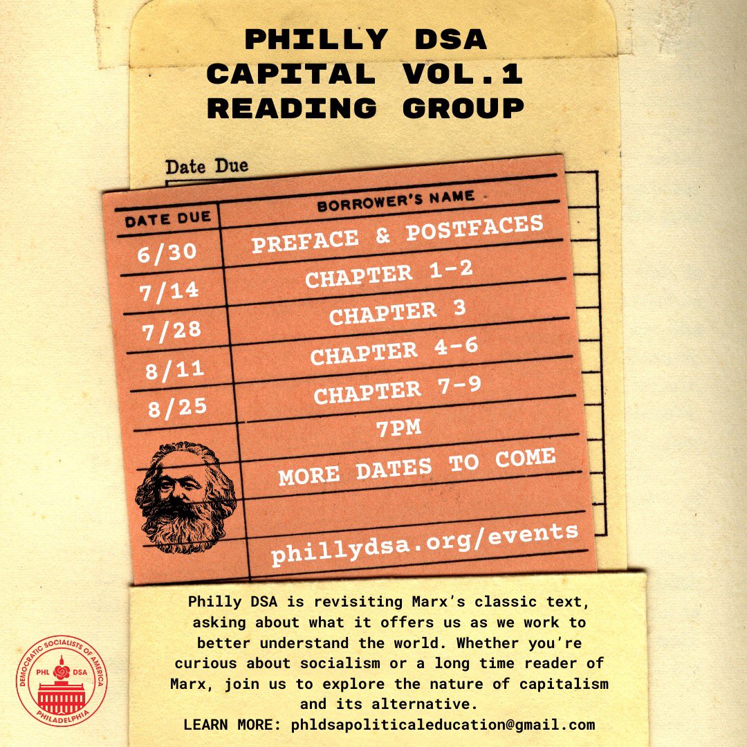 Philly DSA is revisiting Marx’s Capital! Join us for a several part series. We’ll be covering the preface and postfaces this Wednesday at 7pm! This event will be in-person. Vaccination cards and masks required! RSVP below ⬇️ https://t.co/GFAHOJ3VB1 https://t.co/s0fnSfV8aE |