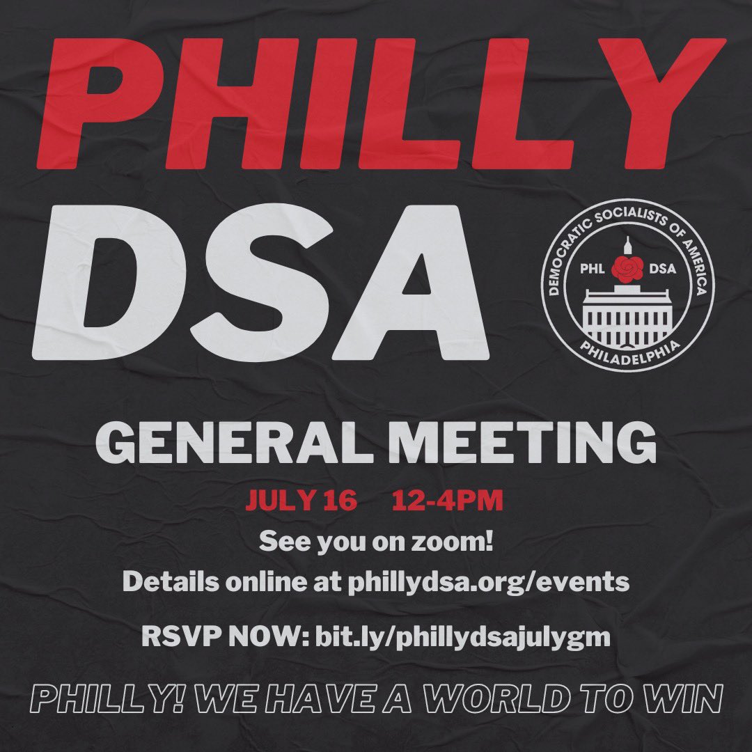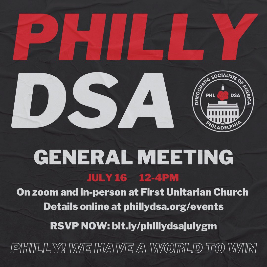 Mark your calendars! Meet us in-person at First Unitarian Church or virtually for our next General Meeting on Saturday, July 16th, from 12-4pm. Resolutions are due by 11:59pm this Saturday to phillydsa@gmail.com with the subject line RESO. RSVP: https://t.co/B6wfWs3gdd https://t.co/wqdBwX0x3E |
