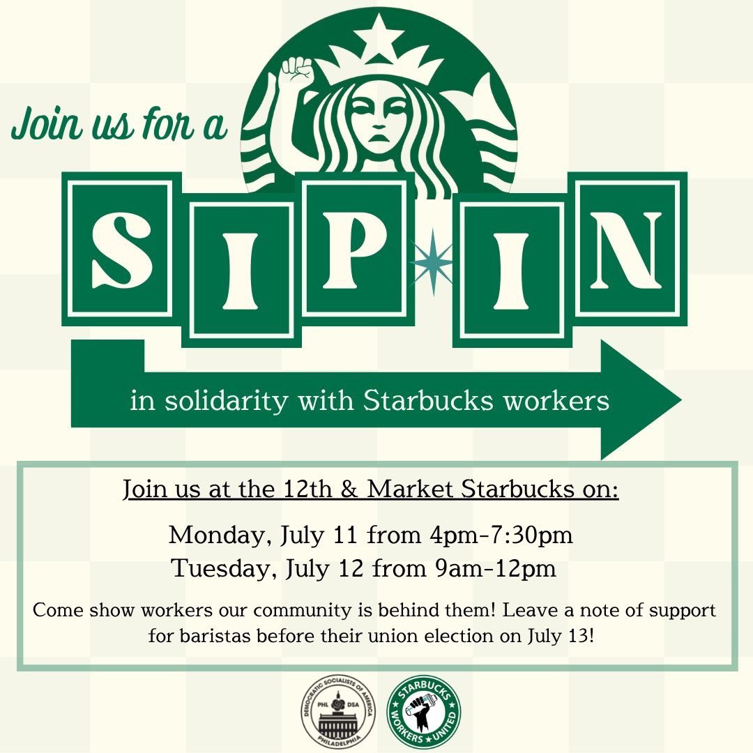 Can you join us this evening or tomorrow morning for a Sip-In at the 12th & Market Starbucks⁉️ Workers at this location are voting on a union on Wednesday, and community support can help them feel supported in voting YES! 💪 Details below ⬇️ https://t.co/b8szj0B78f |