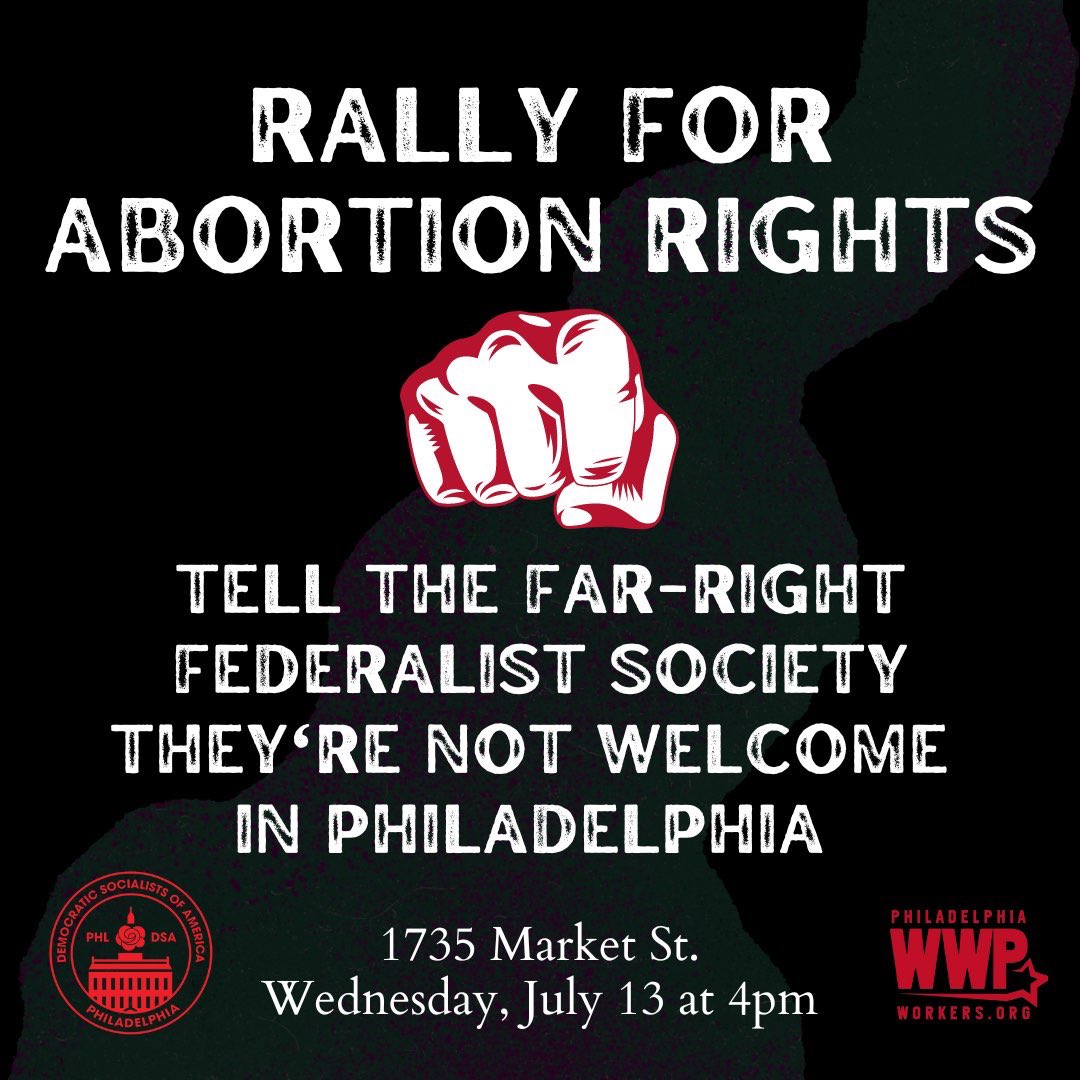 CALL TO ACTION: Tomorrow, we’re protesting the Supreme Court’s decision to overturn Roe and the far-right that helped make it happen. 4pm at 17th & Market. Tell the Federalist Society they’re not welcome in the City of Brotherly Love! https://t.co/ZcoUm9oPmE |
