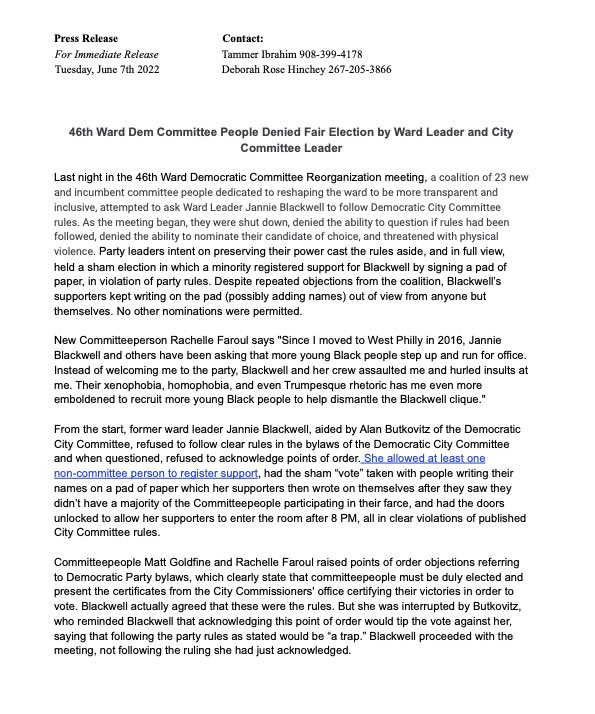 Last night, wards held reorganization meetings across the city. Most proceeded democratically. But in the 46th ward in West Philly, the Democratic machine used a blatantly undemocratic sham ā€œelectionā€ to maintain its grip on power. Read the full release below. https://t.co/z9gqUl7uam 78 11127