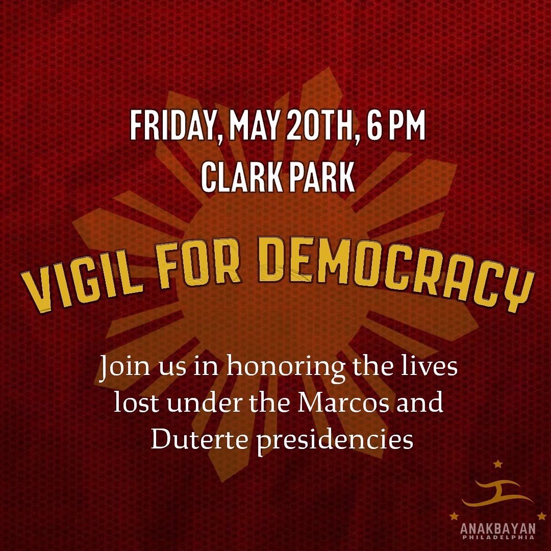 The recent elections in the Philippines threaten escalating hostilities against progressive and socialist forces. Join us at Anakbayan Philly's Vigil for Democracy tomorrow, May 20 at 6pm in Clark Park to stand with Marcos’ & Dutertes' victims. RSVP: https://t.co/MgjPyWTcBf https://t.co/P86ttopGG2 19 11025