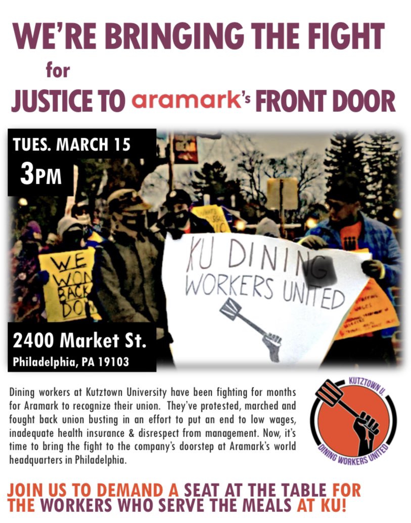 Workers at Kutztown University are fighting for a voice on the job! As Aramark continues its union busting campaign, please join @PJBWU for a solidarity rally in front of Aramark headquarters. Tomorrow at 3pm! 💪🌹 https://t.co/5XKVtdwRzS |
