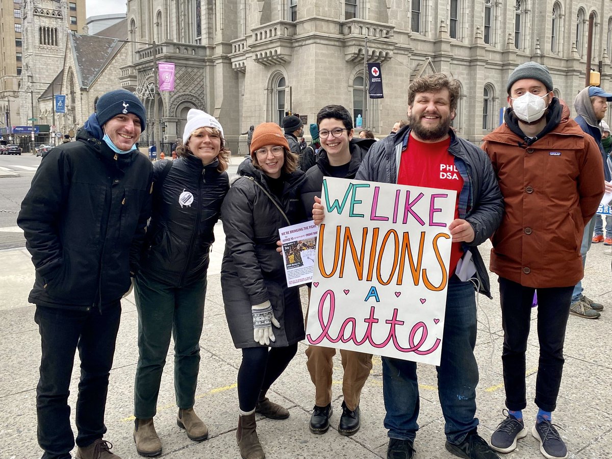 Workers in Philly cafes and coffee shops are unionizing! Philly DSA members were proud to stand in solidarity with workers from Starbucks, Good Karma, Old City Coffee, and Korshak Bagels today 💪☕️ https://t.co/ZhbCTJgweH |
