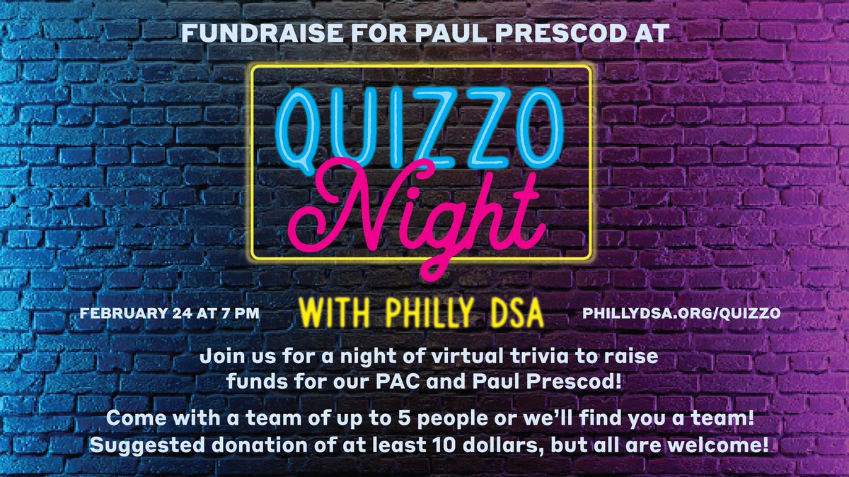 RT @mindyisser: this is going to be so fun!!! sign up here to play quizzo with @PhillyDSA to benefit @paul_prescod and the philly DSA PAC. you don’t need to be a member of philly DSA to play! non members and members of other chapters are very welcome 🤠 https://t.co/RCSiIyMgrH 0 10836