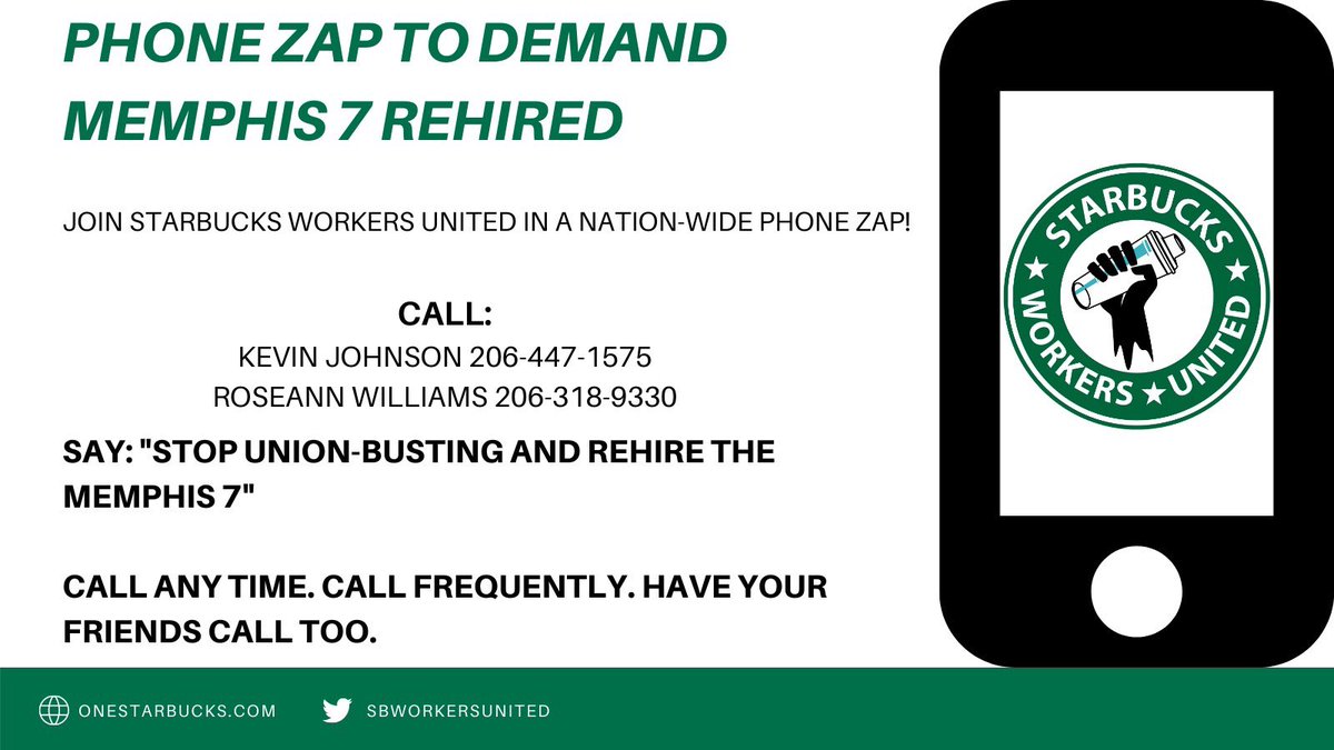 TOMORROW: Stand with the Memphis 7, Starbucks workers who were fired for organizing. Please also leave Starbucks CEO Kevin Johnson & VP Rossann Williams voicemails demanding that they rehire the Memphis 7 and protect the right to unionize. CEO: 206-447-1575 VP: 206-318-9330 https://t.co/o0BmEuvSXA 20 10844