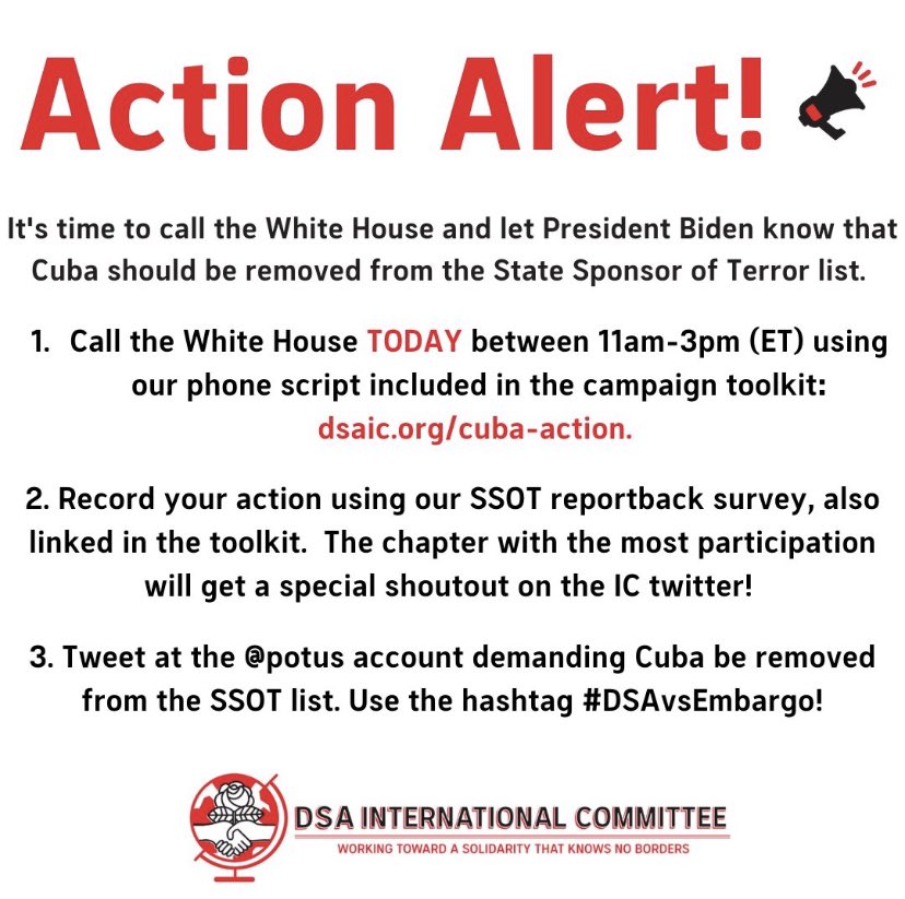 The absurd designation of Cuba as a State Sponsor of Terror is one of the biggest obstacles to diplomacy and normalization, and it damages the lives of ordinary Cubans. Take a moment today tot tell President Biden: Remove Cuba from the list. @WhiteHouse @POTUS #DSAvsEmbargo 🇨🇺🌹 https://t.co/mUeidPK1yI |