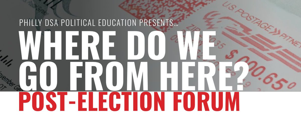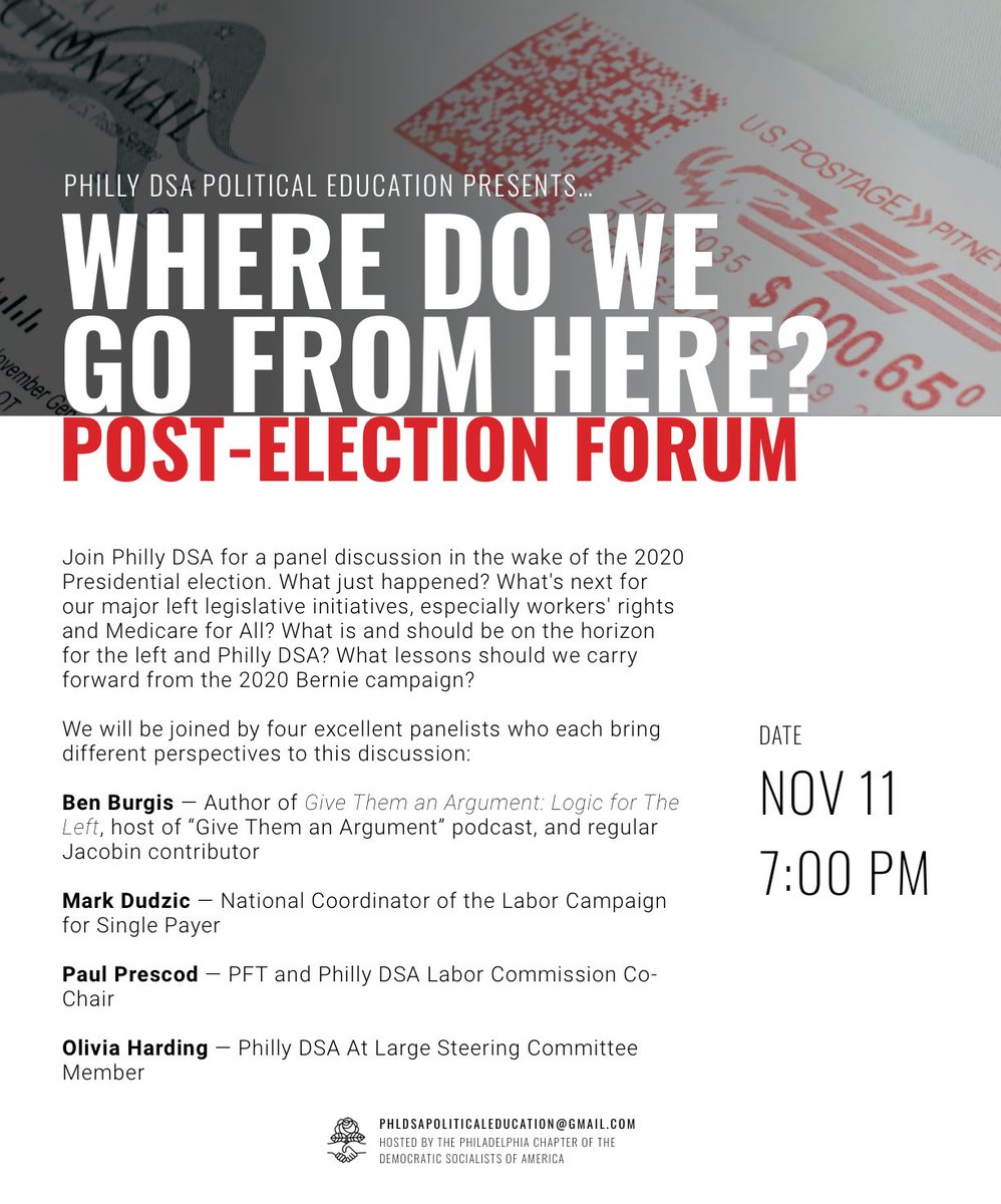 Voters have rejected Trump! So... now what? What's next for our major left legislative initiatives, especially Medicare for All and workers’ rights? Join our post-election forum on Weds. 11/11, featuring Mark Dudzic, Ben Burgis, and Philly DSA leaders! https://t.co/PAxDOlFHSC https://t.co/HG3Jc39CSq |