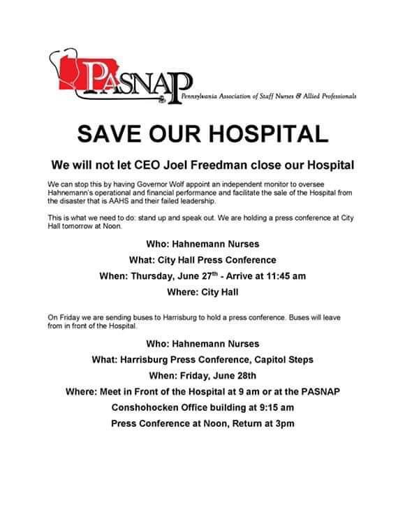Please go to @PennaNurses' press conference today at 11:45 am, at City Hall. Union leaders will speak out against AAHS' failed leadership and demand @GovernorTomWolf appoints an independent monitor to oversee Hahnemann's operational and financial performance! https://t.co/oABbis0hJF 8 9085