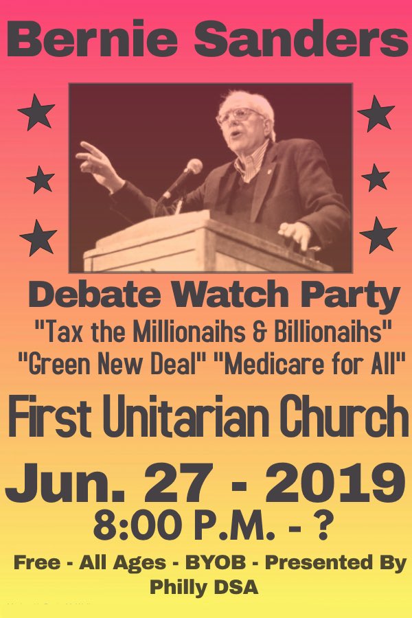Come cheer on Bernie with us tomorrow night at First Unitarian Church! (2125 Chestnut Street, Parish Room) All ages. BYOB. Party starts at 8 & the debate starts at 9. Great way to learn how to get involved in our Bernie campaign and other work! https://t.co/wk4tdWHY99 8 9085