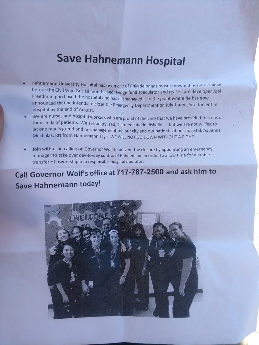 [2/2] whose for-profit health care model drove the hospital into the ground. The workers and patients who rely on Hanhemann deserve better. The city and state must intervene to stop this hospital from closing. 15 9085